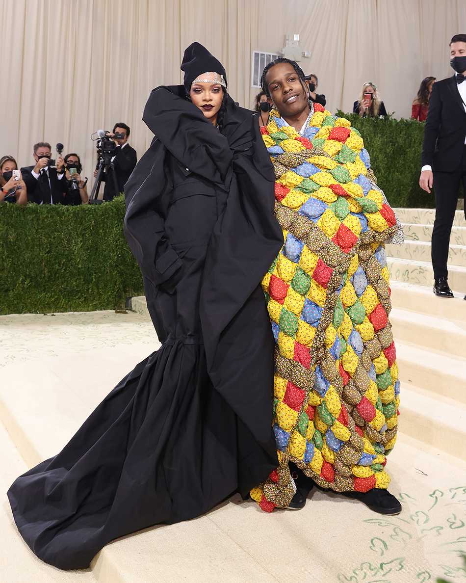 Рианна вместе с бойфрендом A$AP Rocky появилась на ступенях Метрополитен музея уже после завершения официального мероприятия. Одна из самых обсуждаемых звездных пар прибыла на бал Института костюма в похожих образах. Рианна появилась в черном платье-пуховике Balenciaga, а A$AP Rocky — в лоскутной накидке ERL, напоминающей одеяло. Неожиданно для светского мероприятия Рианна дополнила образ шапкой, а также крупным колье и украшением на голове.