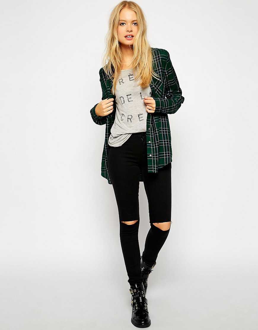 - Романтический городской лук включает в себя рваные черные джинсы, футболку оверсайз и модную во все времена клетчатую рубашку. Завершить образ можно классической шляпой с длинными полями и кожаной обувью без каблука.