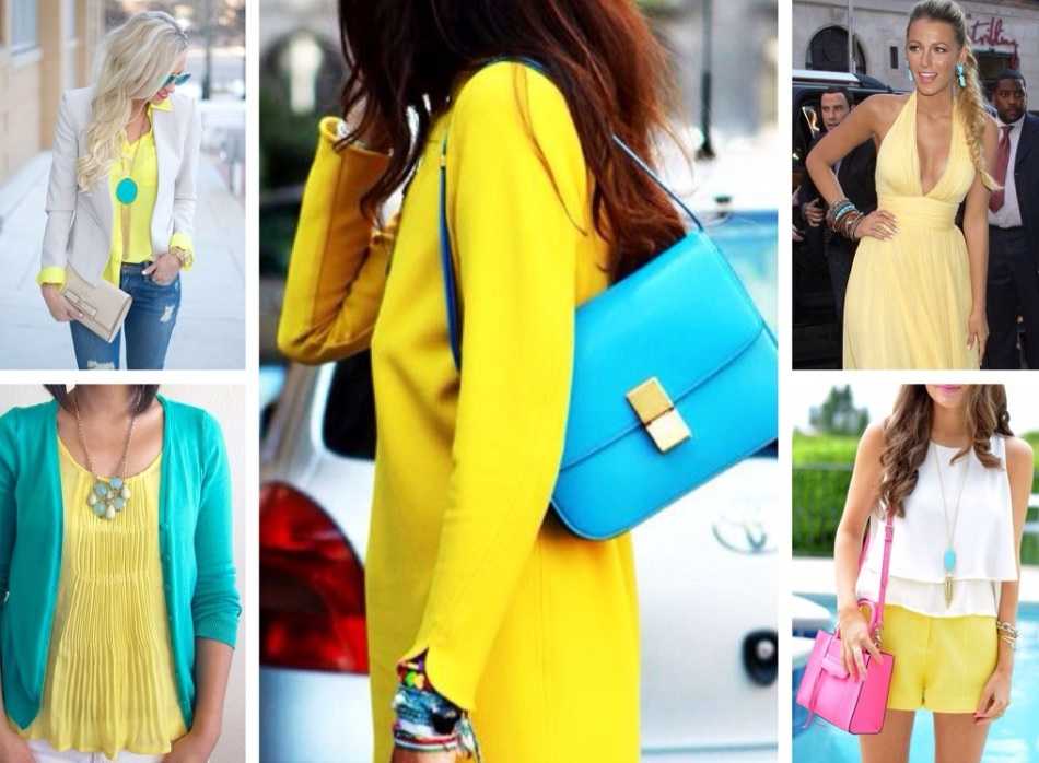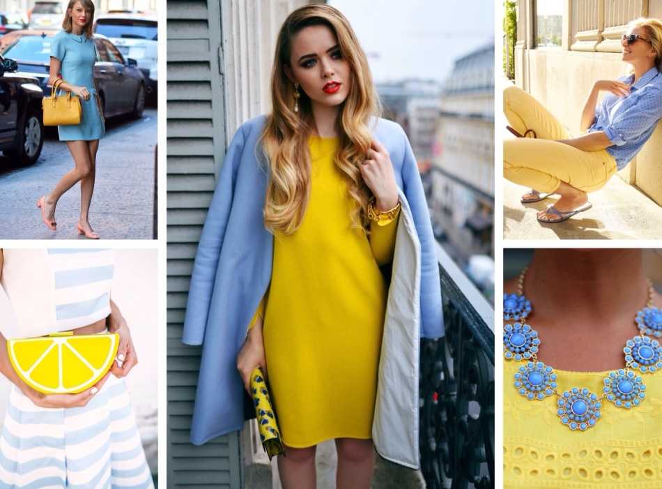 Можно разнообразить образ в голубом (будь то голубые джинсы с футболкой или платье) яркими желтыми элементами, например, украсив шею колье с желтыми бусинами или обув желтые лодочки, взяв желтый клатч. Любой аксессуар желтого цвета никак не будет диссонировать с любым оттенком голубого. Более того, вы также можете менять базовый цвет и разбавлять образ в желтом голубыми элементами.