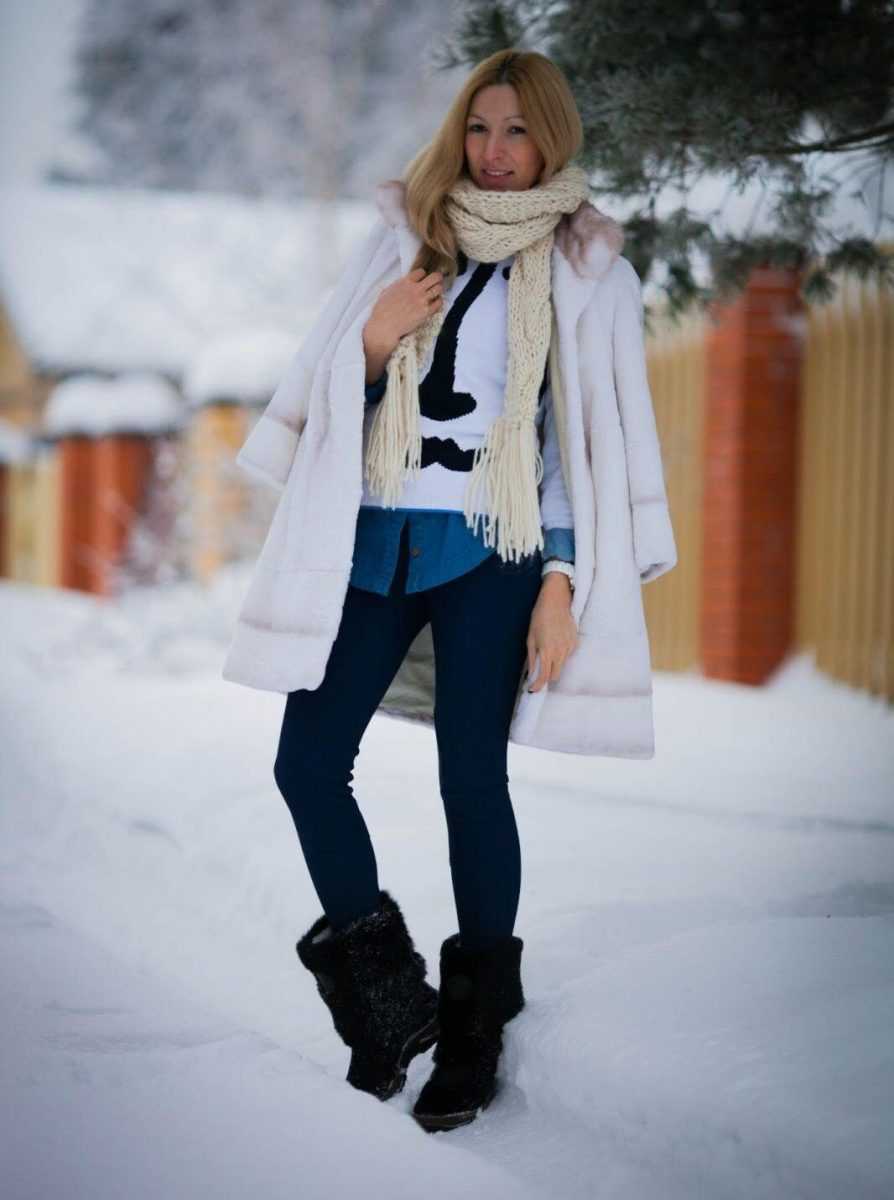- Шубы искусственные и натуральные — чем дороже манто, тем качественнее должна быть обувь. Короткие принято носить с утепленными классическими джинсами или брюками. Под длинную подойдут любые штаны, а вот ботинки должны быть строгими, классической модели. Приветствуется широкий устойчивый каблук.