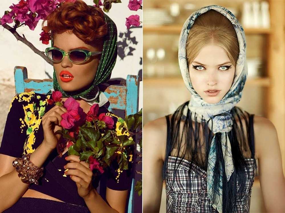 Красиво смотрятся распущенные или уложенные в прическу волосы, дополненные платком на манер повязки.