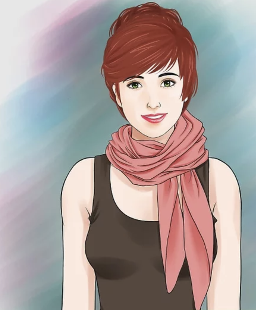 Положите шарф на плечи так, чтобы один конец остался длиннее другого. Обмотайте длинный конец вокруг шеи и оставьте два конца свободно свисать с обеих сторон. Затем берем один конец и просовываем его сверху под треугольник. С другим концом проделывае то же самое. Печенье готово.