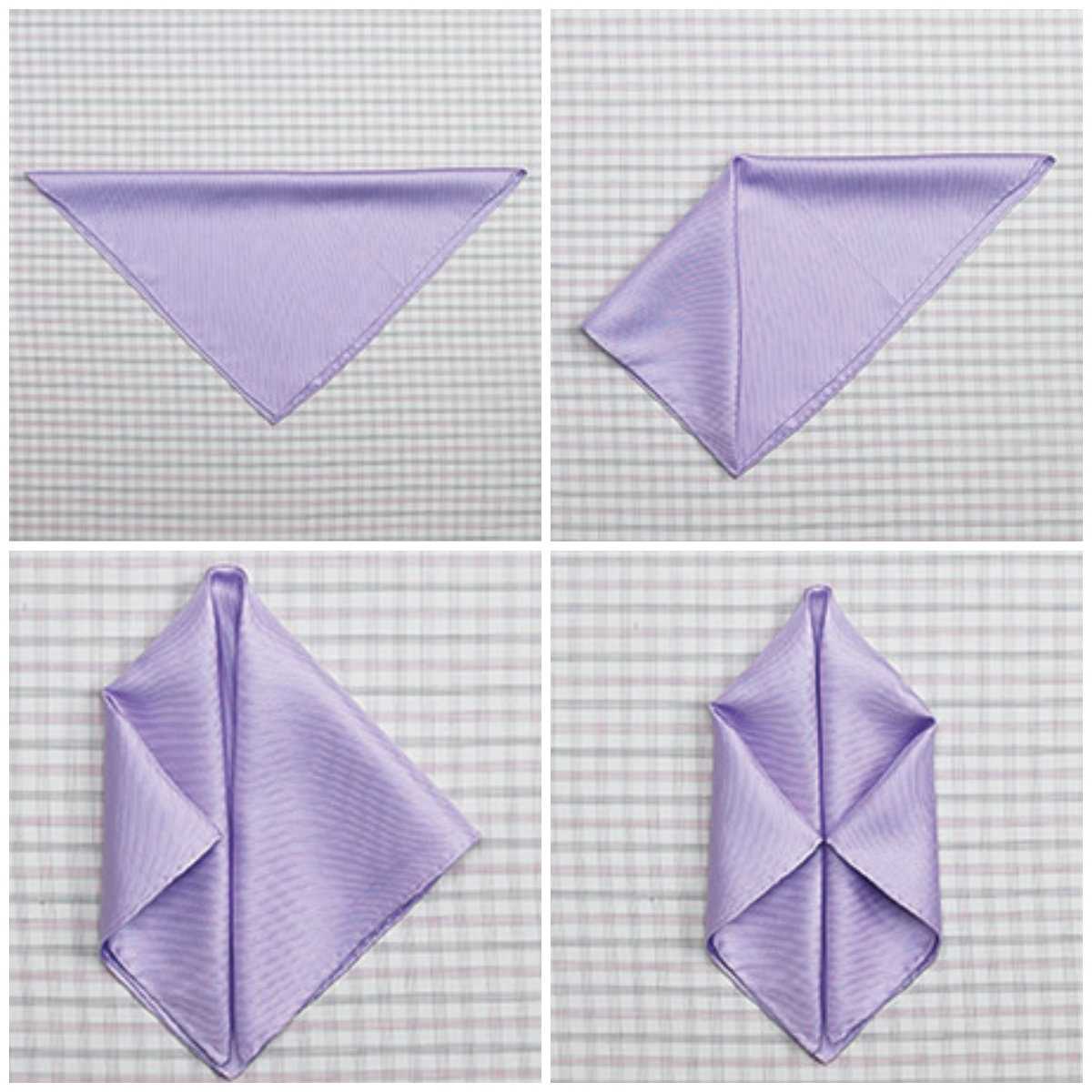 - Четыре уголка. Необходимо как обычно сложить платок в восемь раз. Теперь квадрат сложите в треугольник, немного сместив уголки. Углы, которые образовались снизу, притяните вверх. Таким образом, получится 4 уголка.