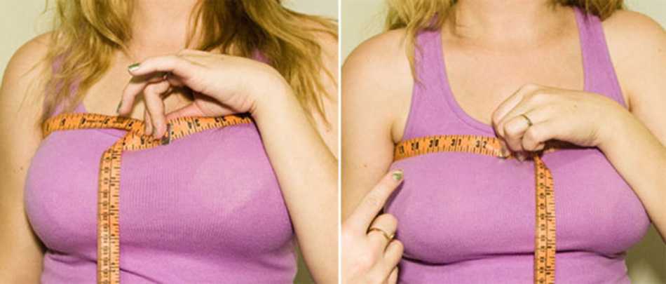 Если известны две величины – обхват груди и обхват под грудью, то получится узнать размер бюстгальтера более точно. Определение второй величины уже рассмотрено. Для получения первой лента должна проходить по самой выпуклой части груди, не перетягивая ее. Обязательно убедиться в параллельном расположении ленты по отношению к полу.