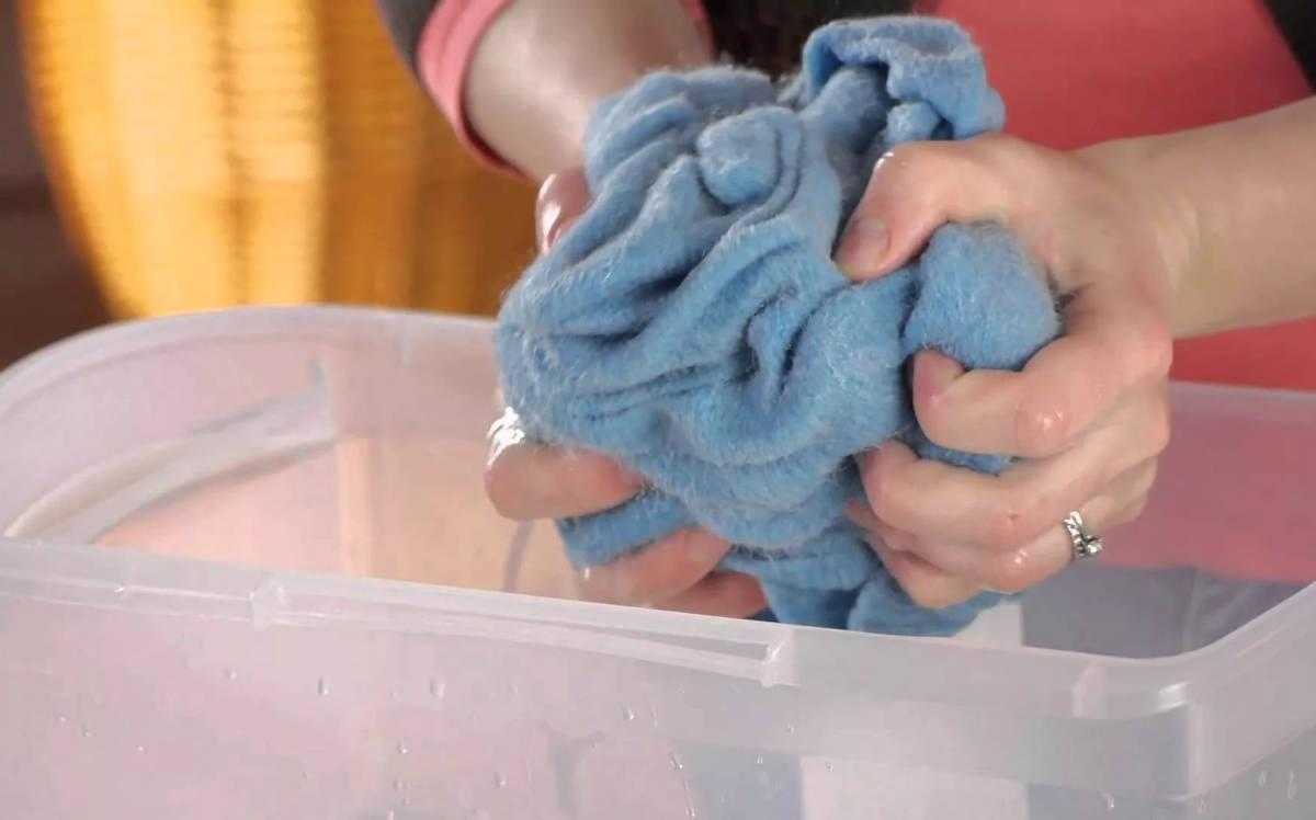 - Замочите вещь в прохладной воде на 10-15 мин, дав жидкости полностью впитаться в нити.