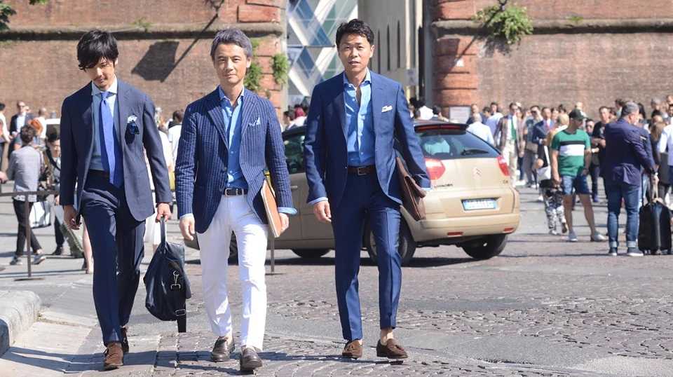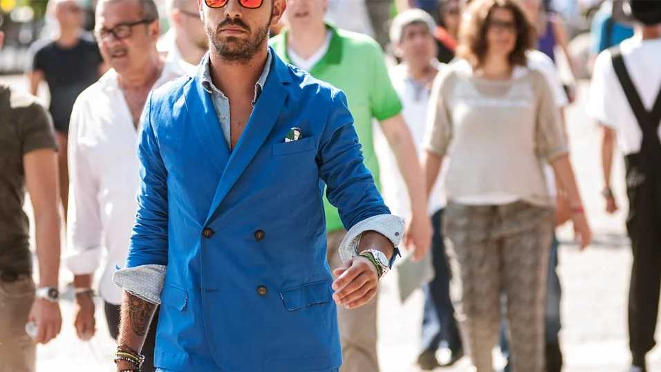 Даже если мужчина переодевается в консервативный стиль, он все еще может многое выиграть, осветляя оттенок синего, который он носит. Поскольку эти трое мужчин демонстрируют скромные изменения в синем цвете, они трансформируют изображение предметов одежды. Если бы эти парни были одеты в темно-синий цвет, у них могло бы сложиться впечатление, что они были титанами зала заседаний, но с их мягкими плечами, коричневыми ботинками и тоненькими брюками они выглядят так, как будто они направляются к стакану охлажденного Prosecco, а не для презентации PowerPoint. Таким образом, они дают нам урок о том, как управлять иногда сложным переходом от офиса к работе, что имеет отношение к мужчинам из Флоренции, как и к финансовым районам мира, особенно когда ты едешь на работу.