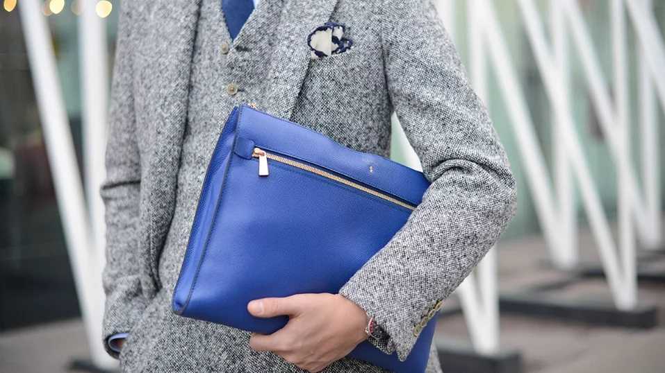 Хорошо продуманный аксессуар – отличный способ продемонстрировать некоторую ловкость в рамках консервативной деловой одежды. Здесь замечательный твидовый костюм надевается поверх классической бледно-голубой рубашки и шерстяного галстука. Тем не менее, глаз обращается на драматический портфолио, созданный из кожи цвета лазурита, которая изменяет восприятие зрителем всего наряда.