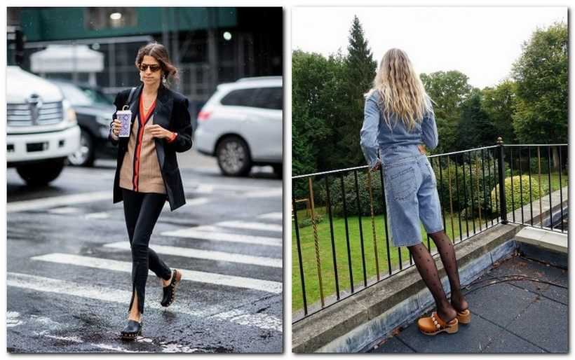 Чтобы понимать, с чем лучше носить обувь, необходимо учитывать материал — в данном случае дерево и кожа — натуральная доминанта, которая предполагает сочетание с такими же тканями костюма. Поддержкой данного аргумента служит пример 60–70-хх годов прошлого столетия, когда мир захватило движение хиппи. Модницы того времени предпочитали джинсы, рубашки из хлопка, льна, длинные слегка расклешенные платья из тех же тканей. В этот период стали модными клоги или колодки на среднем каблуке с заклепками. Каждая модница мечтала купить джинсы и такие босоножки. В сегодняшней моде все выглядит намного сложнее, нежели раньше: