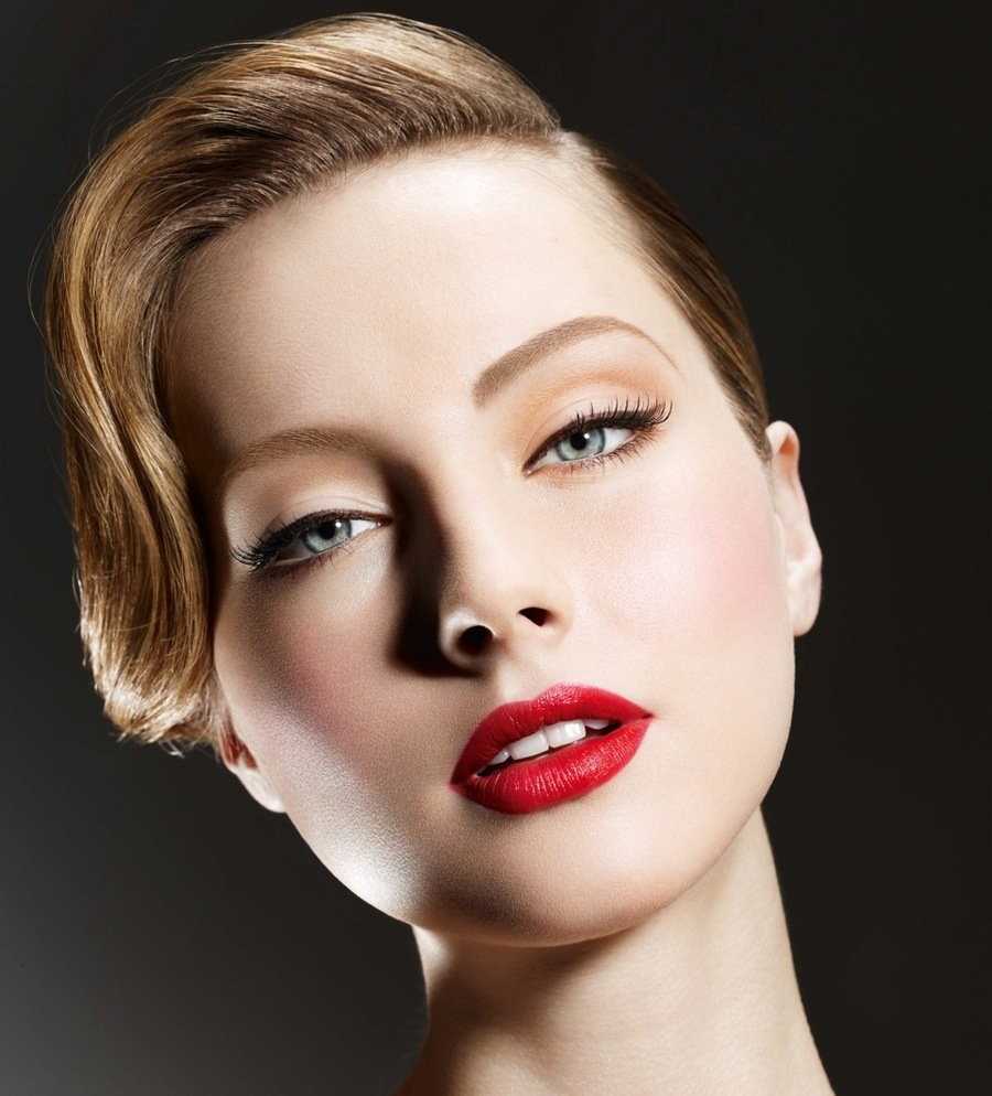 - С акцентом на губах: яркая помада красного или розового цвета, немного румян и минимальное количество теней. Коричневая или черная тушь.