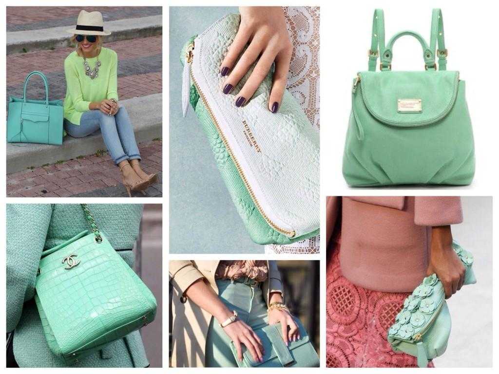 - клатч в мятном цвете (хорошим вариантом для деловых дам может стать крупный клатч в таком же оттенке, как и пальто);