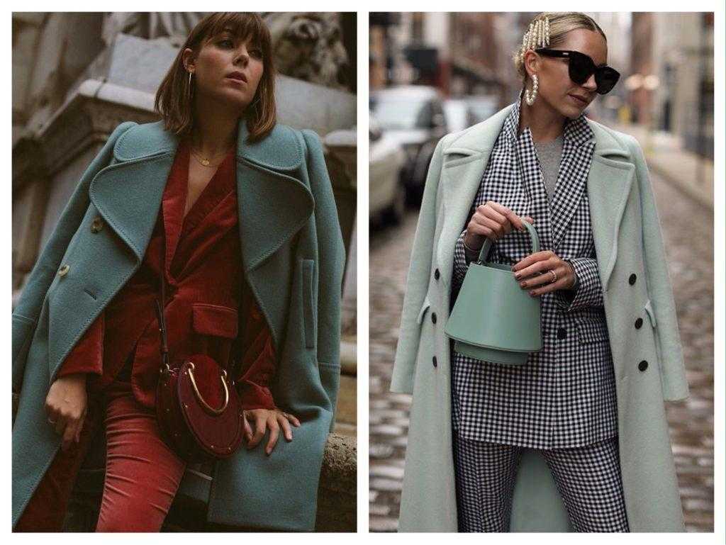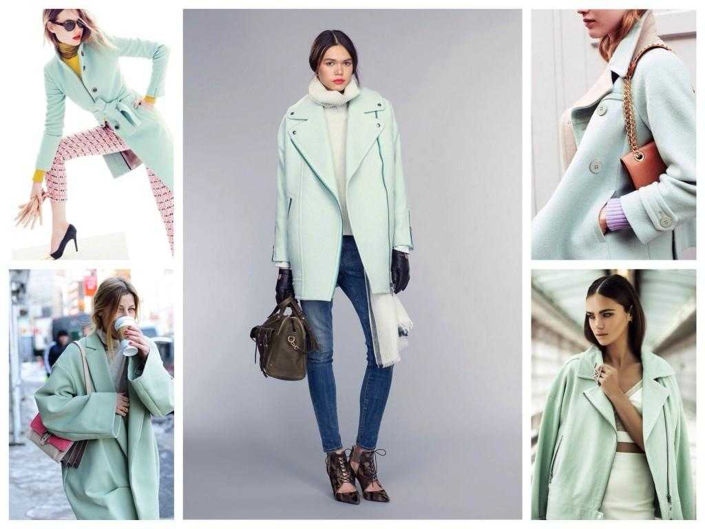 Мятное пальто всегда вносит в образ нотку романтичности. Они отлично смотрятся с повседневным гардеробом, в частности хорошо подходят узкие джинсы или лосины, а также юбки мини и миди длины. Для деловых дам пальто цвета мяты не является табу. Его можно сочетать со строгими платьями-футляр или юбкой-карандаш средней длины.