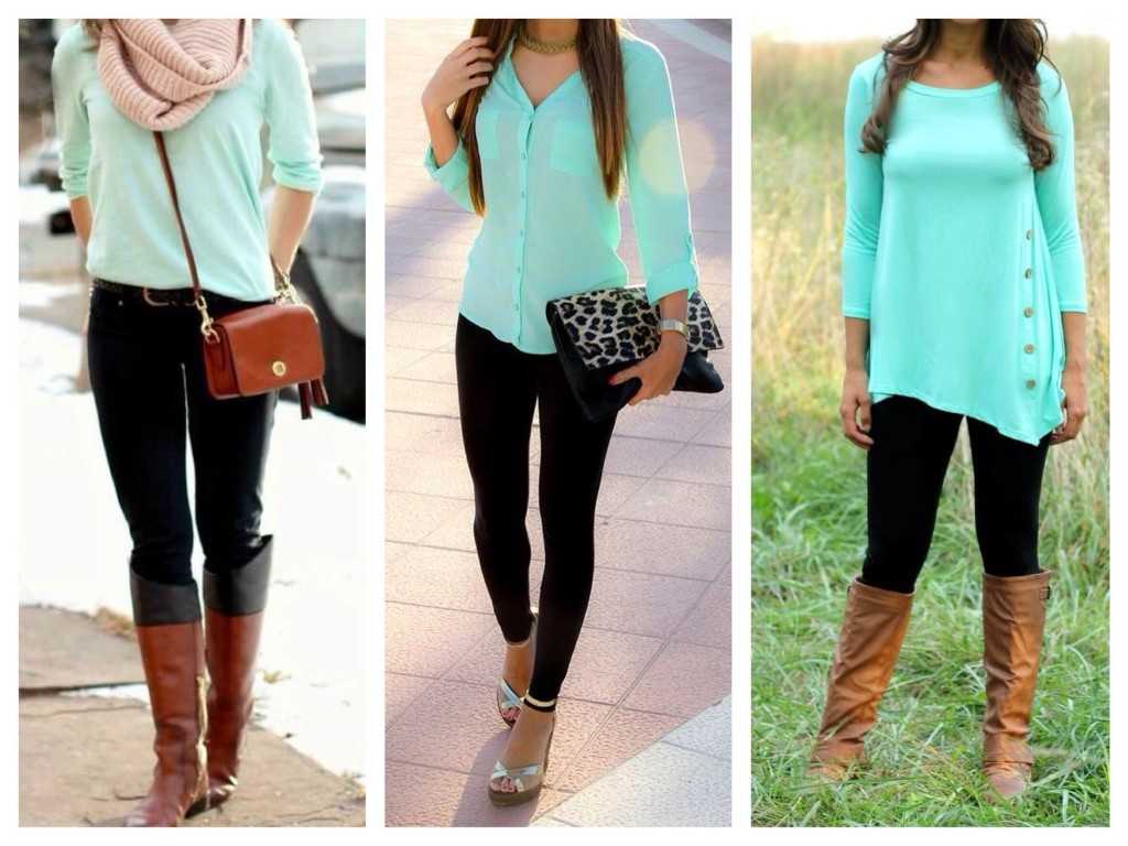 Цвет мяты предполагает очень свежий и расслабленный образ. Лучше всего подходят луки в стиле кэжуал. Узкие джинсы скинни или лосины в сочетании с блузкой или красивым свитером, а также романтичные юбки-солнце или колокол в тандеме с лонгсливом или толстовкой считаются идеальным сочетанием для повседневного варианта.