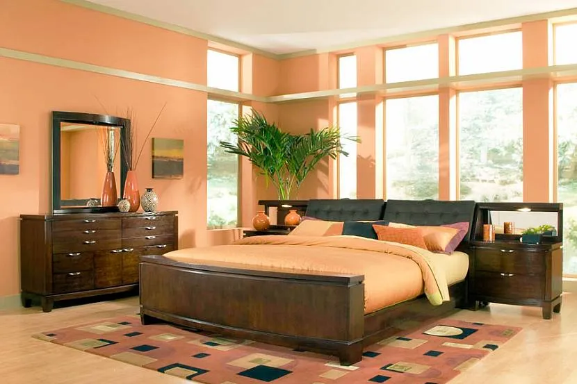 Деревянная мебель на фоне персиковых стен в спальнеИсточник yandex.by