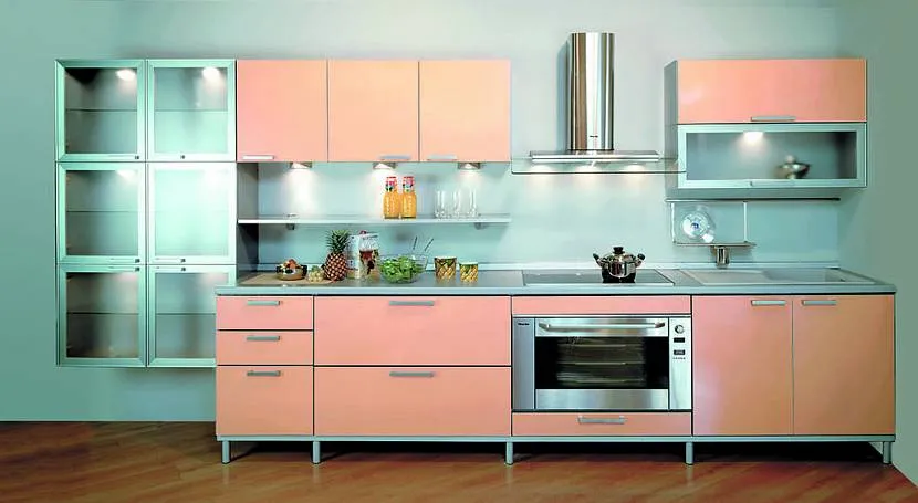 Сочетание персикового и мятного цветов в дизайне кухниИсточник krovati-i-divany.ru