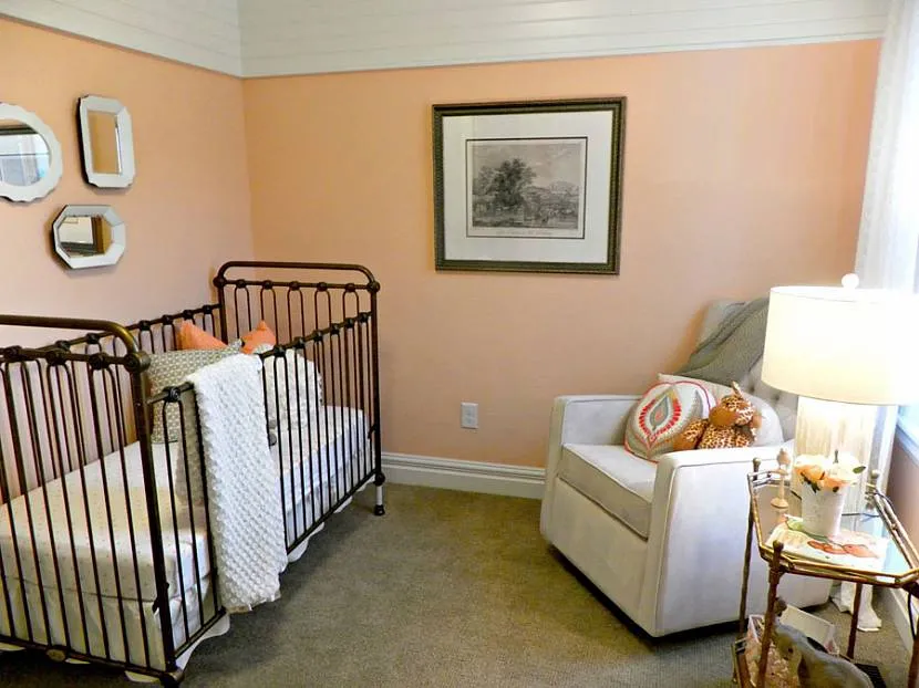 Белый цвет. Это один из лучших компаньонов для нежных оттенков. Персиковые стены с белой мебелью, окнами, светильниками, деревянным покрытием пола делают интерьер веселым, теплым и уютным. Данное сочетание подойдет для оформления детской комнаты.