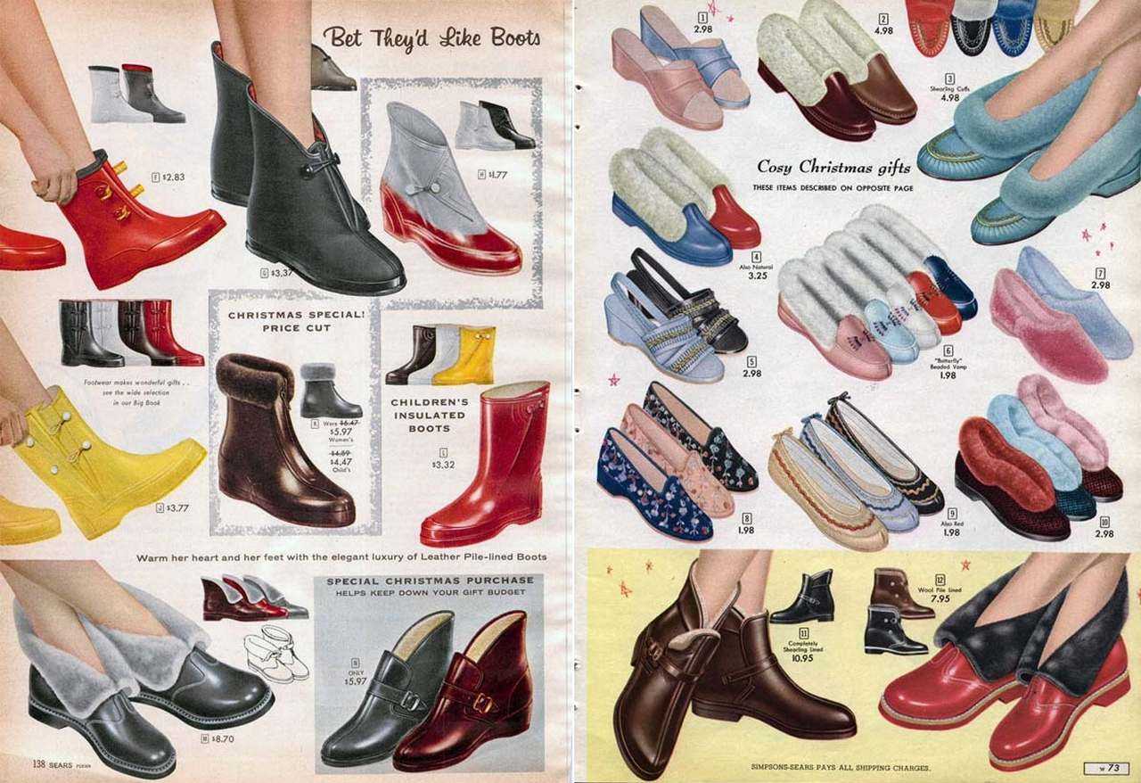 В начале десятилетия дамы носили обувь с каблуком «kitten heels» высотой до 5 см. Затем появился «шок» – каблук, выгнутый наружу, «запятая» – вогнутый внутрь, высокая «шпилька». Ноу-хау обувщиков 50-х – чтобы тонкий высокий каблук не ломался, в него стали вставлять металлический стержень и обтягивать кожей.