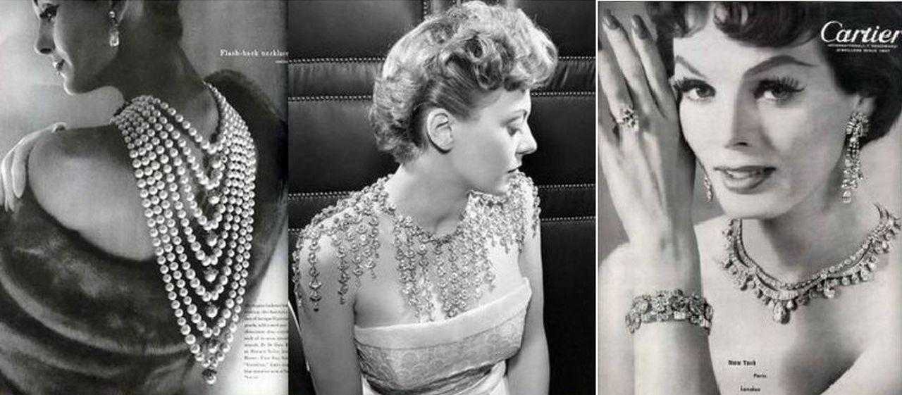 Самым модным и изысканным украшением считался жемчуг. Нитку жемчуга или жемчужные бусы женщины носили практически к любому наряду. Вместе с тем в моде были брошки, клипсы, массивные браслеты. Оригинальное направление – украшения в виде птиц, животных, растений – сменило прежние геометрические формы.