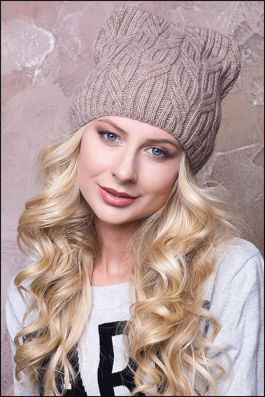 Фактурная вязка – «косичка», «шишечка», «лесенки» делают изделие объемным. Перед покупкой нужно примерить шапку, важно, чтобы она не сделала голову слишком большой. Правильно подобранный фасон будет хорошо выглядеть с любой одеждой