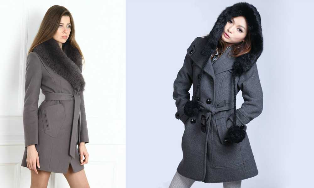 Красиво смотрятся также серые пальто короткой длины с отложным воротником и подчеркивающим талию поясом.