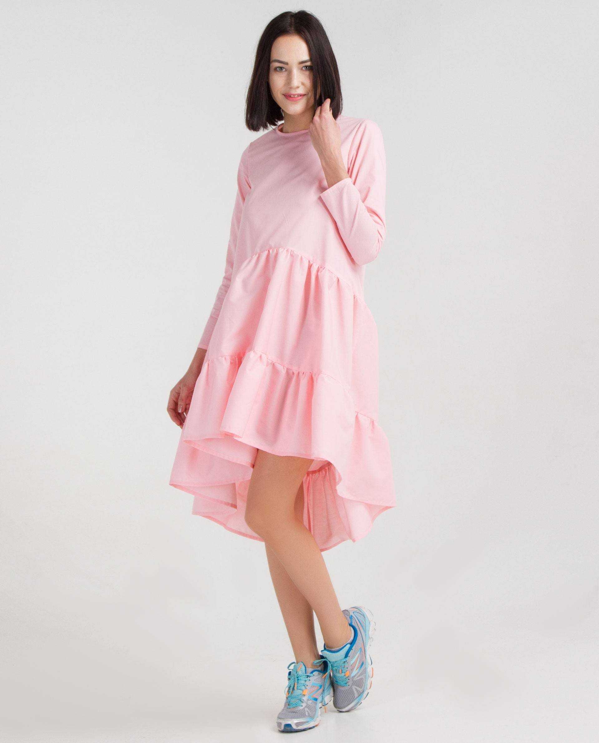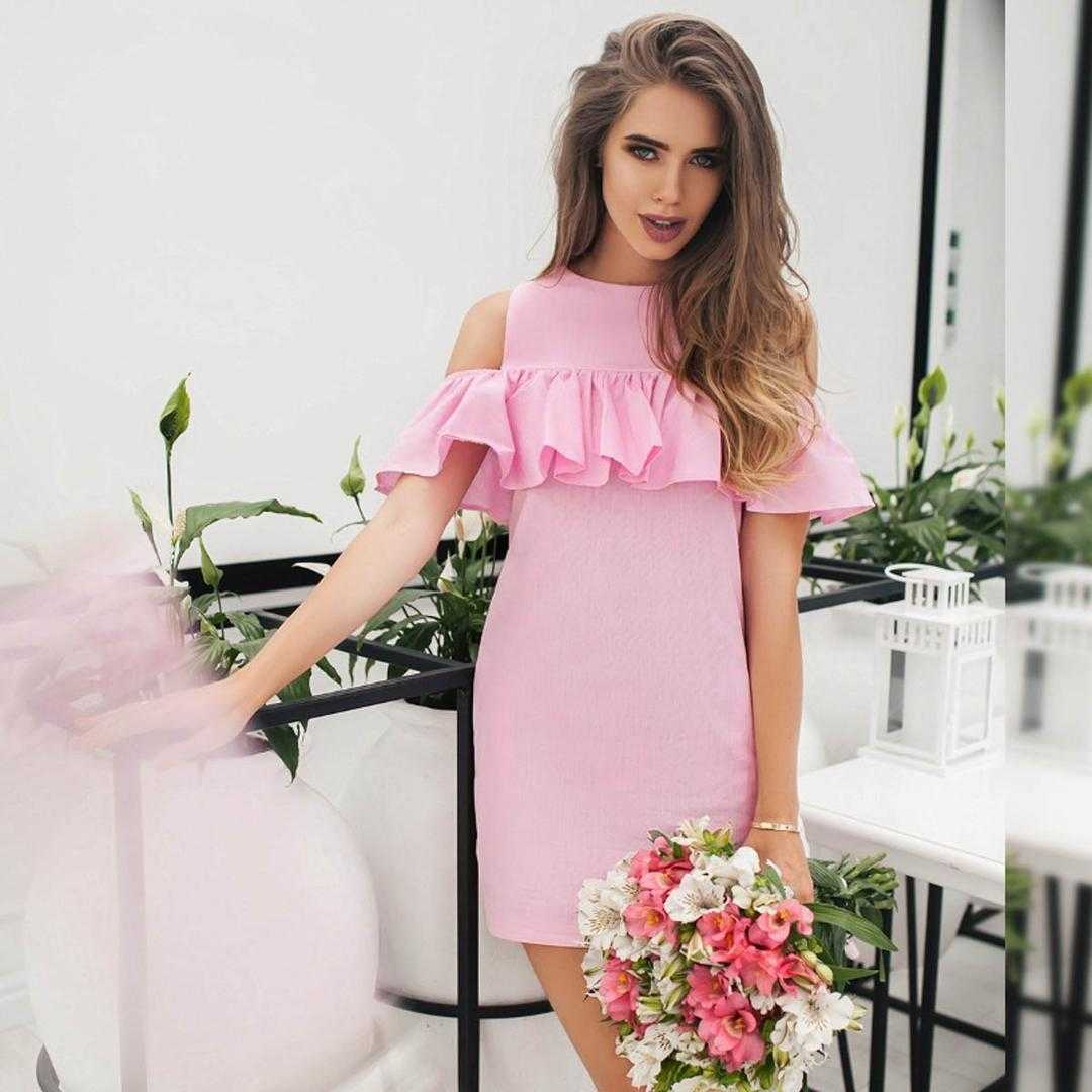 Розовое летнее платье с воланом на плечах поможет придать луку юной озорницы нотки романтичности и нежности. Притом можно выбрать наряд практически в любом оттенке розовой палитры, если композиция создается для молодой особы.