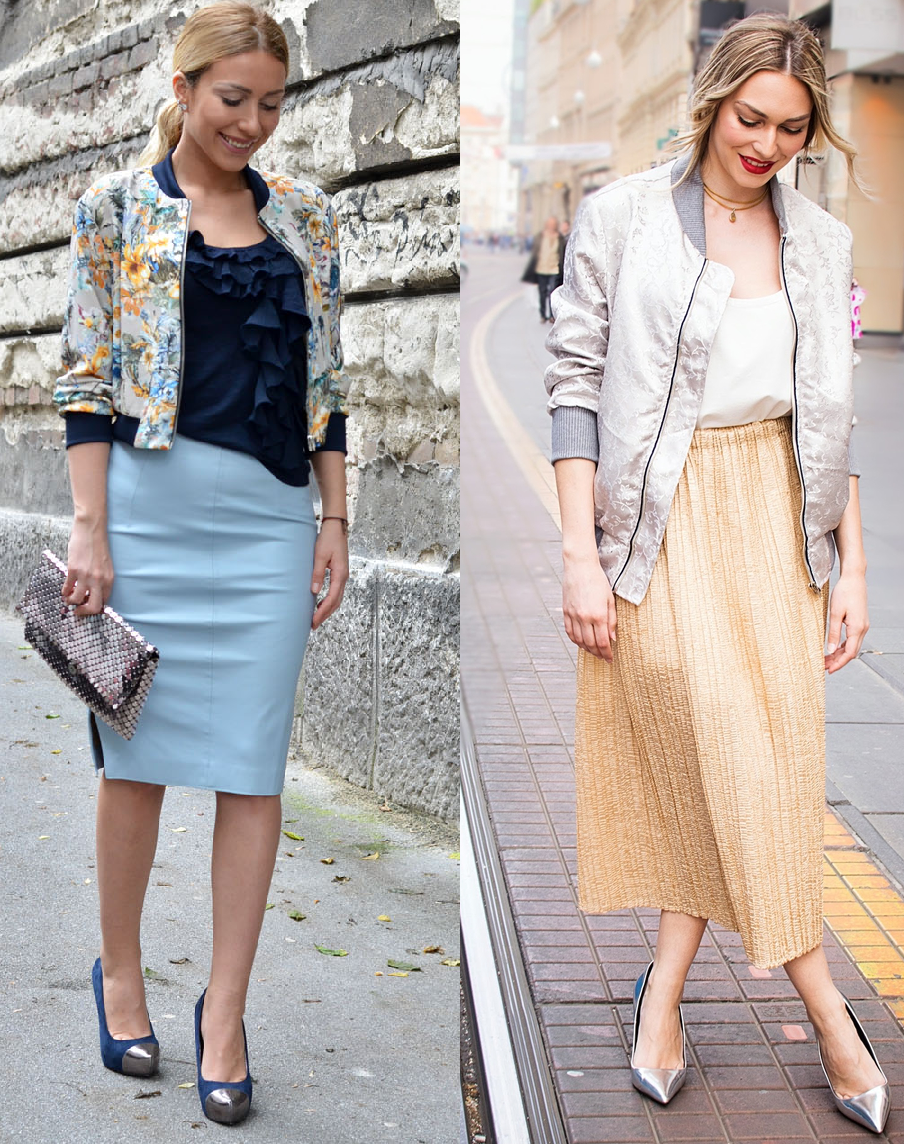 Спортивный бомбер отлично сочетается с элегантными фасонами юбок: солнце-клеш, годе, тюльпан, карандаш. Хорошо смотрится как с длиной мини, так и с макси. Юбки могут быть не только узкими, но и свободными, в сборку, однотонными, цветными, с геометрическими принтами. Дополните комплект топом, любой блузкой, белой рубашкой.