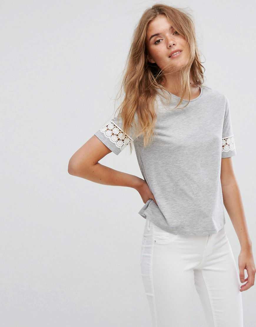 Вы легко можете позволить купить себе футболку с декором. Пусть это будет стильная бахрома или модная шнуровка. В моде модели с кружевом (выбираем качественные материалы), с оборками, бантиками, рюшами. Главное – не переборщить с декором и не выглядеть “дорого-богато”.