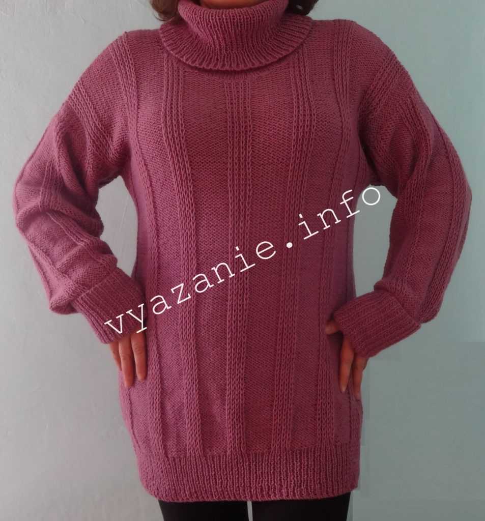 Объемный женский свитер оверсайз Посмотрите, какой свитер получается, если связать его английской резинкой. Он длинный и объемный, поэтому в нем будет тепло и уютно зимой. Оригинальная горловина указывает на современное исполнение этого изделия. В последнее время в моде такая легкая небрежность в одежде: горловина, которая не складывается, и сделана в виде небрежной стойки, длинный рукав и небольшая растянутость к низу кофты.