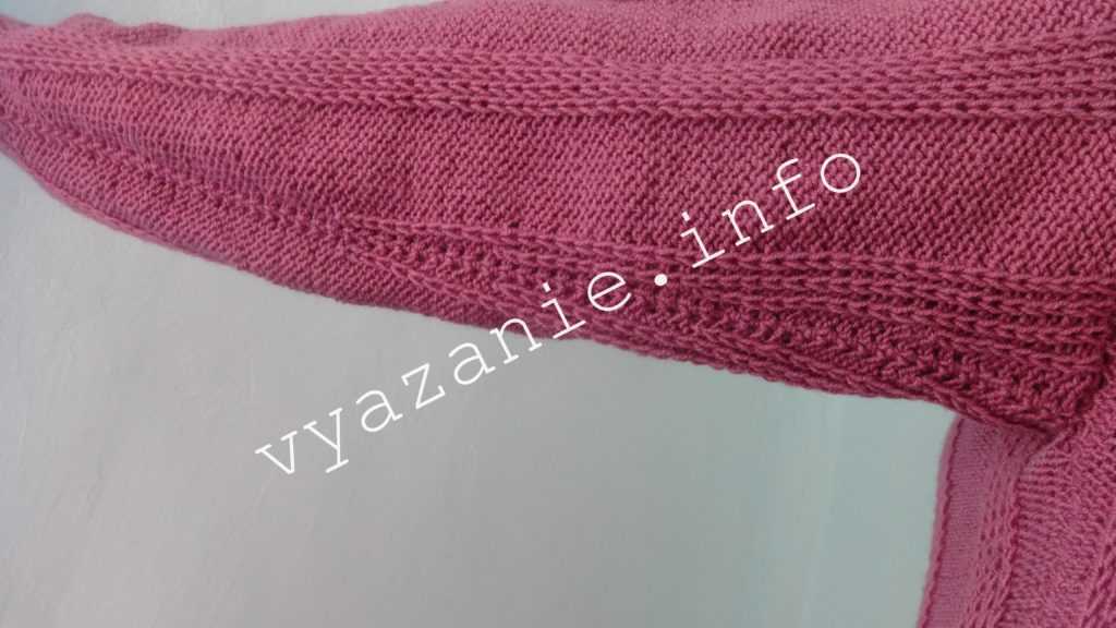 - Через 52 (51) сантиметр от 1-го рядка закройте с обеих сторон 1 раз 2 петли. Получатся скосы рукава-реглана.
