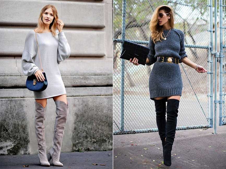 Модели, имеющие высокое голенище, сочетаются с леггинсами, узкими джинсами, туниками, объемными свитерами и вязаными платьями. Сапоги на шпильках смотрятся откровенно и вызывающе, поэтому не рекомендуется надевать с ними одежду с глубоким декольте или яркими декоративными элементами. Женщинам, не знающим, с чем замшевые ботфорты на каблуке носить, можно порекомендовать как вечерние, так и повседневные наряды. Особенно эффектно обувь смотрится с шерстяными или вязаными юбками и платьями А-силуэта, которые популярны зимой.