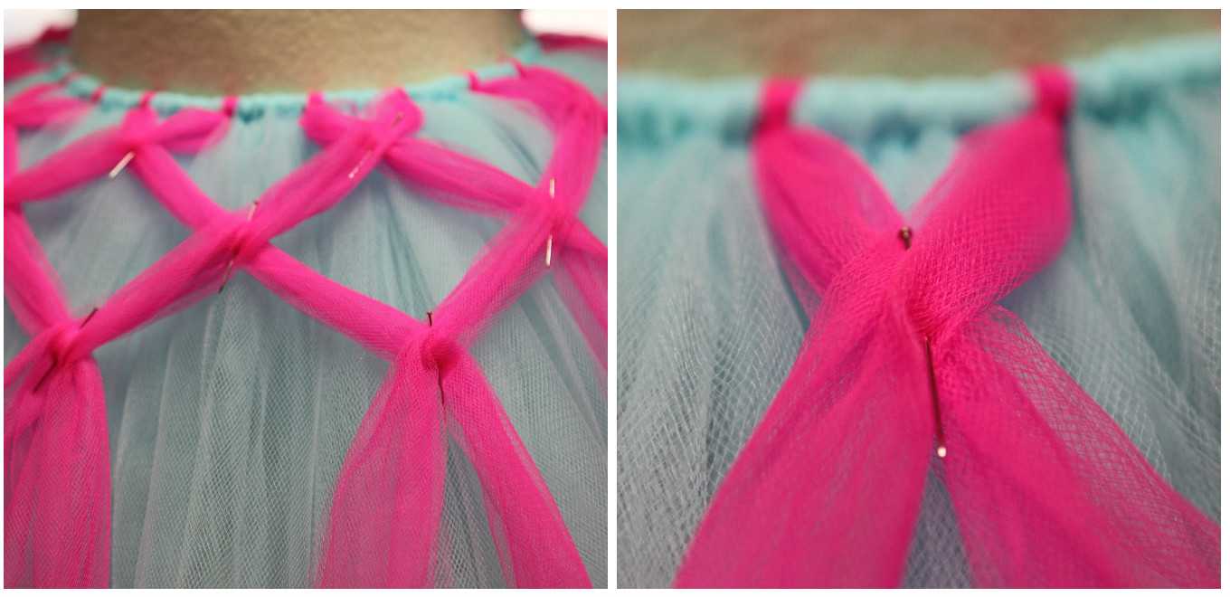 Если для основы верха используется сетчатый топ, фатин будет крепиться прямо к нему, продеваясь сквозь отверстия первого ряда. В других случаях надо использовать широкую мягкую резинку