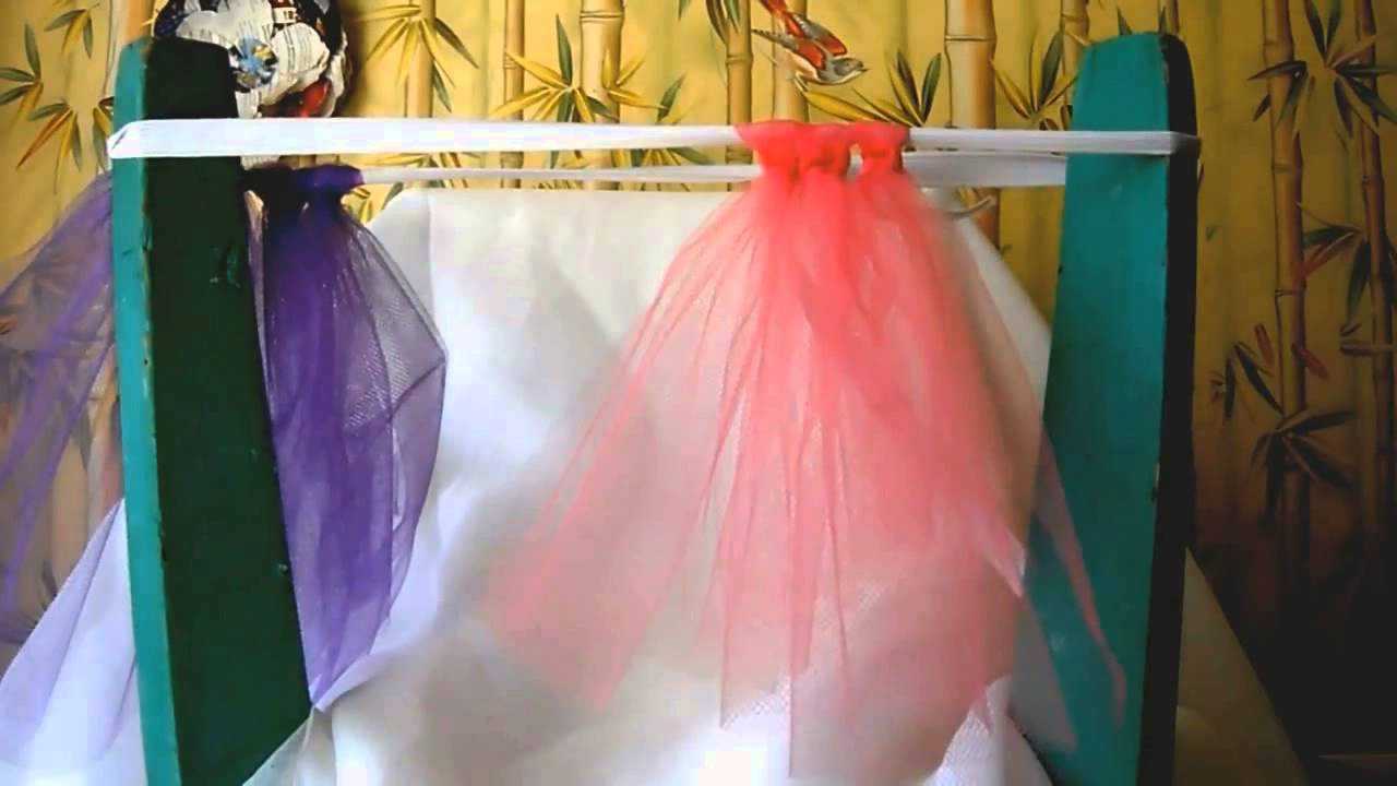 Далее берём эластичную тесьму и закрепляем её на любой поверхности (например, на спинке стула). К тесьме привязываем куски фатина в два узелка. Продолжаем до тех пор, пока не обвяжем всю эластичную тесьму. Чтобы юбочка выглядела опрятно, кончики фатина подравниваем острыми ножницами. На всё про всё уйдёт максимум полчаса!