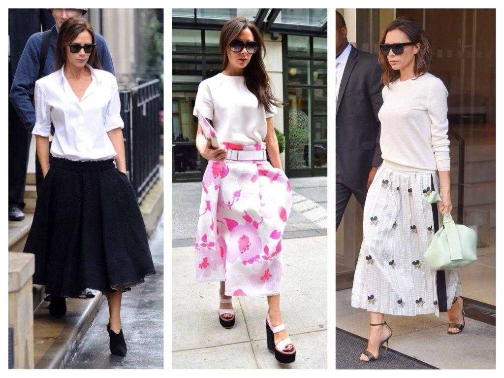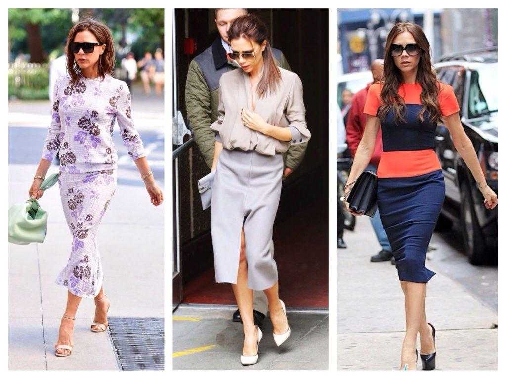 Юбки и платья также любимы Викторией. Каждая коллекция от дизайнера предлагает интересные варианты моделей, сама же модница их носит с удовольствием, как видно на фото. И в первую очередь — платья футляры. Благодаря женственному силуэту они помогают подчеркнуть талию, придать фигуре плавные изгибы. То же касается и юбок карандашей, особенно с завышенной талией.