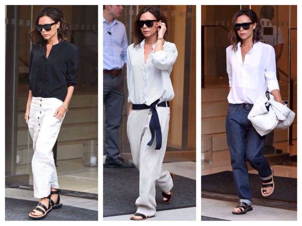 Будучи персоной публичной, Виктория Бекхэм повседневный стиль не ассоциирует с простыми леггинсами, растянутыми свитерами и кроссовками. Любой выход из дома для нее является поводом для демонстрации хорошего вкуса. Надевая прямые или зауженные джинсы с облегающей рубашкой или элегантной блузой, она обязательно завершает образ изысканными туфлями на высоком тонком каблуке, являющимися ее визитной карточкой. Даже на прогулке с детьми звезда выглядит потрясающе, выбирая короткие платья А-образного фасона или модели в стиле baby doll, выполненные в лаконичном дизайне.