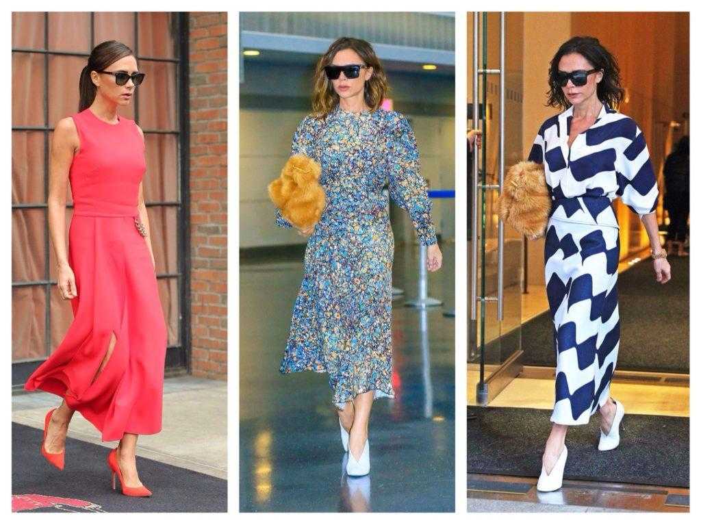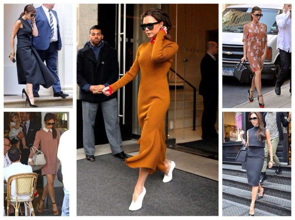 Многие знаменитости носят наряды Виктории Бекхэм, стоимость которых варьируется в пределах $2000, но она отдает предпочтение одежде, созданной дизайнерами Chloé, Céline и Balenciaga. Практически все платья объединяют благородная ткань с гладкой фактурой, приталенный силуэт, длина чуть ниже колена и минималистский декор. Играя с классическими цветами, звезда разбавляет их тривиальность необычным кроем нарядов, экспериментируя с вырезами декольте, длиной рукавов. Среди повседневных нарядов можно увидеть короткие платья в стиле семидесятых и прямые модели с басками.