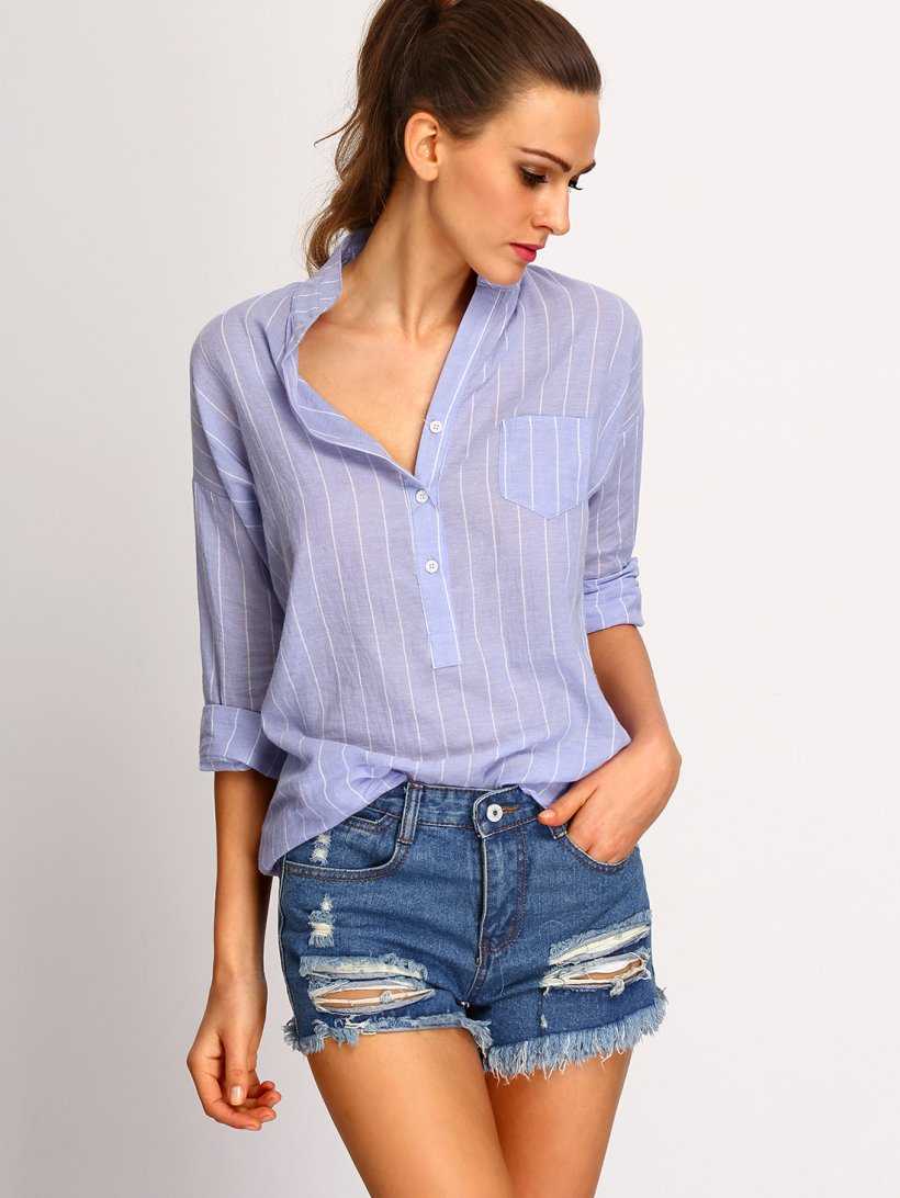 Еще один классический вариант – блуза рубашечного кроя. Она напоминает строгую мужскую рубашку простого кроя своими накладными карманами, манжетами и стоящим воротником. Для того, чтобы добавить образу изысканности и женственности, дополните его пастельного цвета пиджаком, изящными лодочками и юбкой.