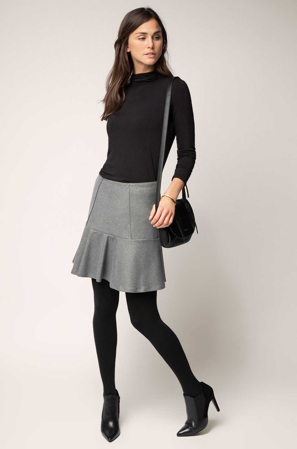 Свитер из ангоры и юбка асимметричного кроя — сочетание с характером, но в рамках офисного стиля.