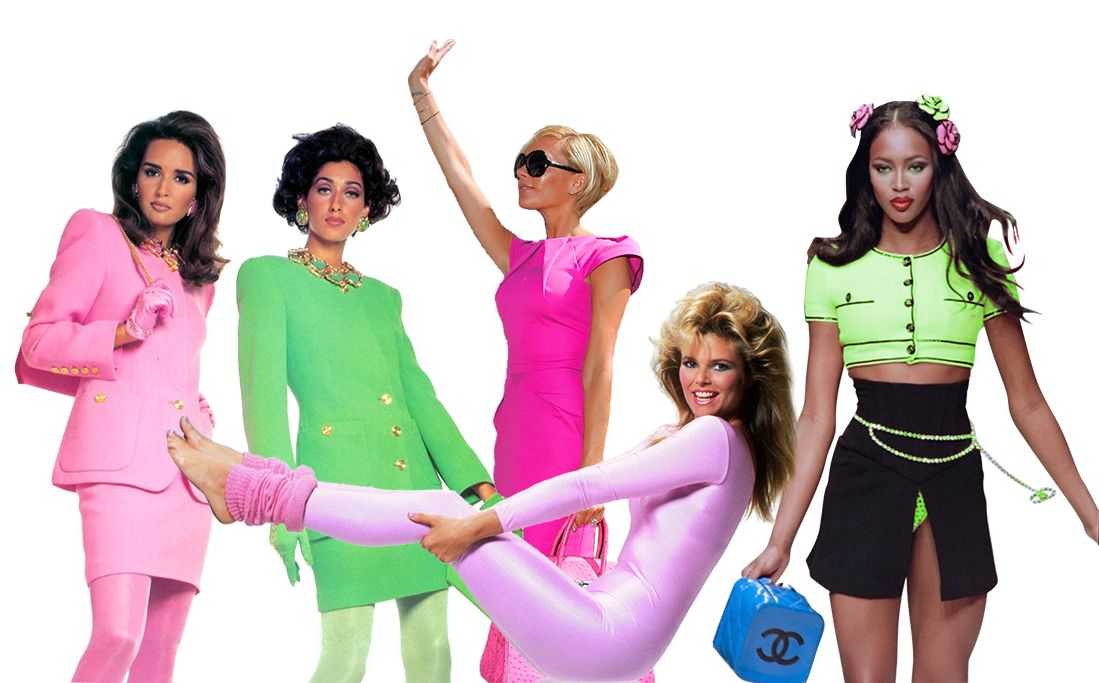 На фото (слева направо): модели из рекламы Escada 1990-х годов, Виктория Бекхэм в 2007 году, Кристи Бринкли на съемках в 1980-х, Наоми Кэмблелл на показе Chanel весна-лето 1994Неон впервые вошел в моду в 1980-е годы вместе с развитием технологий по окрашиванию тканей: последние разработки в эту эпоху уже позволяли экспериментировать с самыми необычными оттенками, и в том числе со светящимся неоном. В 1980-е флуоресцентные цвета были особенно популярны в спортивной одежде, а типичный инструктор по аэробике считал своим долгом надеть что-нибудь кислотно-желтое или ярко-розовое, чтобы ученики не теряли его или ее из виду даже в дальнем углу зала. В эту эпоху неоновая одежда с трудом выходила за рамки спортивного стиля, хотя истинные провокаторы, напимер Мадонна, уже заставляли флуоресцентные оттенки работать на себя с целью привлечения внимания. В следующем десятилетии неон ждал настоящий успех, когда даже Chanel пустились делать свои фирменные и строгие твидовые костюмы в неоновых оттенках. В 1990-е флуоресцентными и чуть ли не светящимися в темноте становятся повседневные куртки, пиджаки, юбки и даже обувь и украшения. В неон влюбляются модные журналы и стилисты телевизионных программ, ведь яркие цвета на обложке или на ведущей – лучший способ запомниться зрителям. В 2000-е годы армия дизайнеров – поклонников неона только растет и растет, кислотные оттенки из спортивных и подростковых превращаются в гламурные, с тех пор как в неоновой фуксии создаются даже невероятно дорогие сумочки Hermès Birkin.