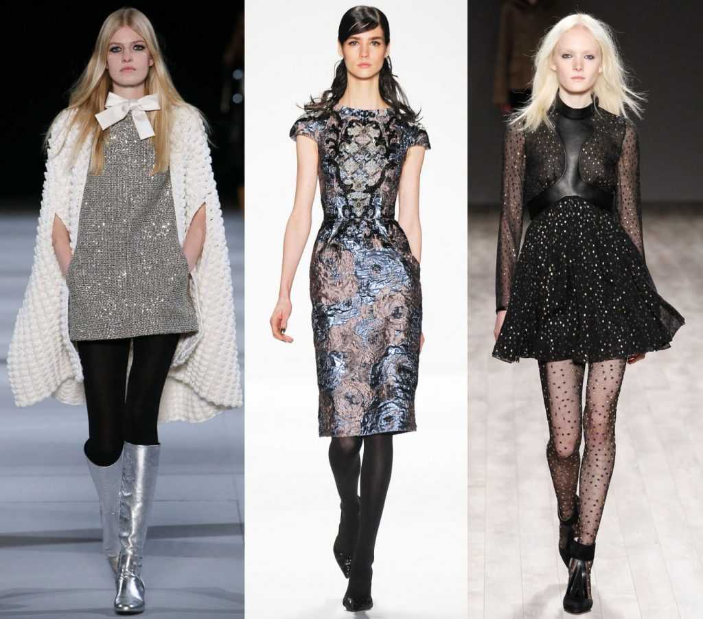 2. Если вы одели маленькое черное платье (в том числе из шелка или органзы), то выбор должен пасть на черные тончайшие колготки. 3. Кружевные и узорные чулочки лучше подходят к гладким тканям. Но, чтобы наряд не казался совсем мрачным, сделайте хотя бы акцент – накрасьте губы красной помадой и возьмите в руки алый клатч. 4. Чтобы стать праздничной версией иконы стиля (особенно в платье, в котором открыты спина, плечи и руки), черным моделям можно предпочесть незаметные телесные колготки. Только будьте внимательны с оттенком и фактурой – необходимо выбирать матовые варианты (избегайте отливов!) максимально приближенные к вашему тону кожи, на ноге они должны быть слегка заметными! Свежо, легко и очень по-новогоднему! 5. Если черное платье в деловом стиле из плотной ткани или трикотажа, колготки выбирайте также плотные, как черные, так и другого цвета, который не будет «биться» с классическими лодочками. Гармонично смотрятся благородные тона (коралловые, оливковые и винные оттенки). 6. С черным платьем из матовой ткани смело можно надевать колготки с мерцающим эффектом. Но помните, что кислотно-яркие цвета делают образ менее дорогим.