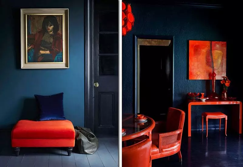 | Сочетание красного с тыквенным. | Для разбавления рекомендована холодная зеленоватая цветовая гамма и чёрные акцентные пятна. |
