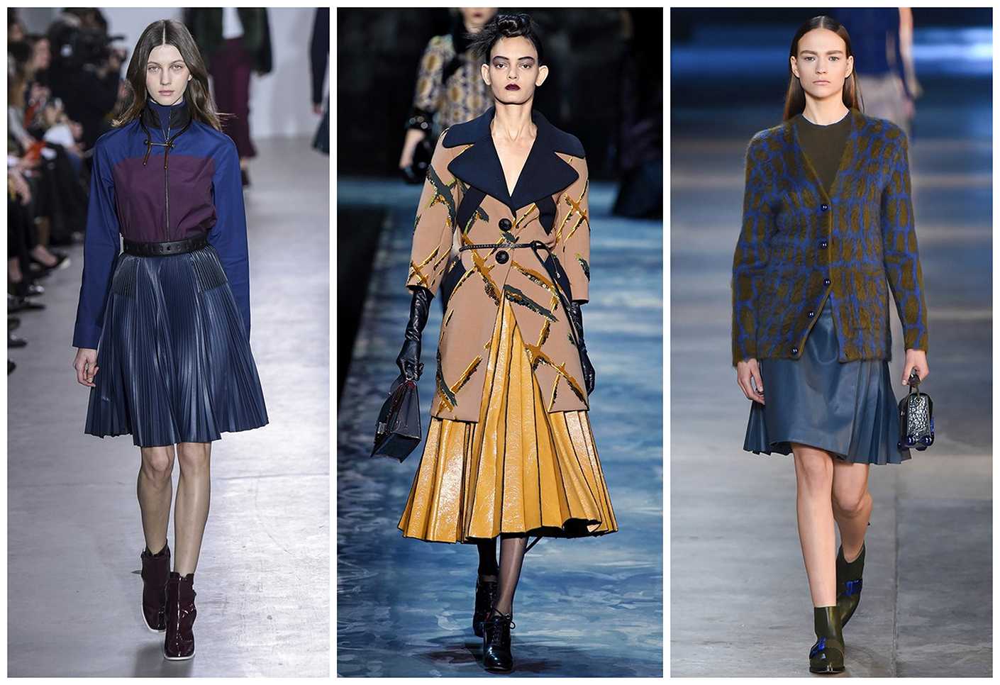 Играть с фактурами и сочетать несочетаемое – основной тренд сезона. Легкое плиссе гармонично выглядит в тандеме с верхом из кожи, а юбочку из плотных тканей, стоит дополнить нежным джемпером.