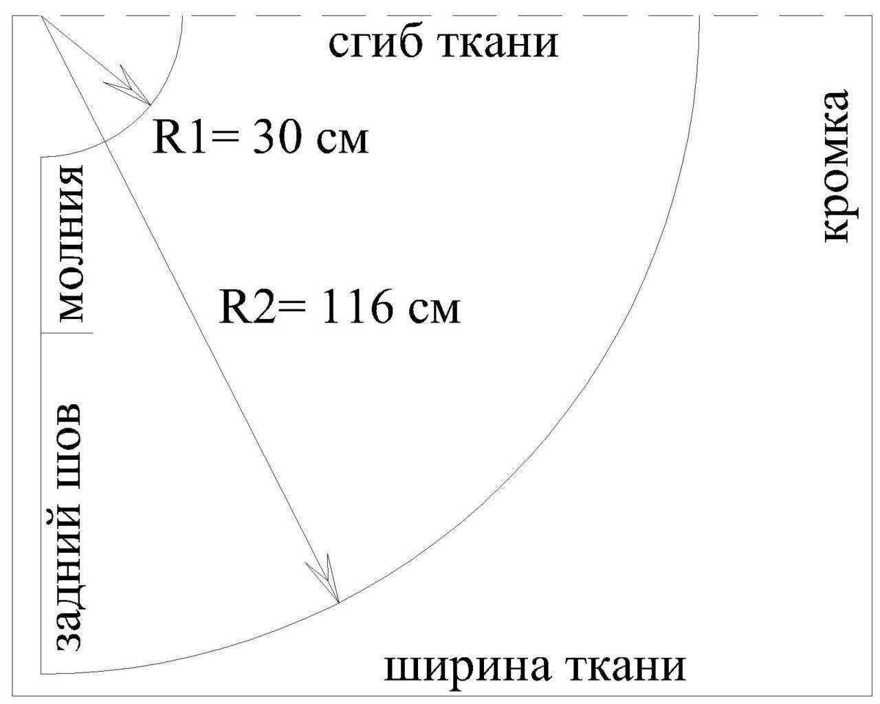 Поскольку сама модель включает в себя складки, расход ткани на них увеличится. Рассчитать конкретные цифры можно по следующим формулам. Если объем талии 66 см, а длина юбки от талии до пола 1 метр, то: R1 = Обхват талии \ 3,14 = 66 \3,14 = 21 см. R2 = R1 + длина юбки = 21 + 100 = 121 см