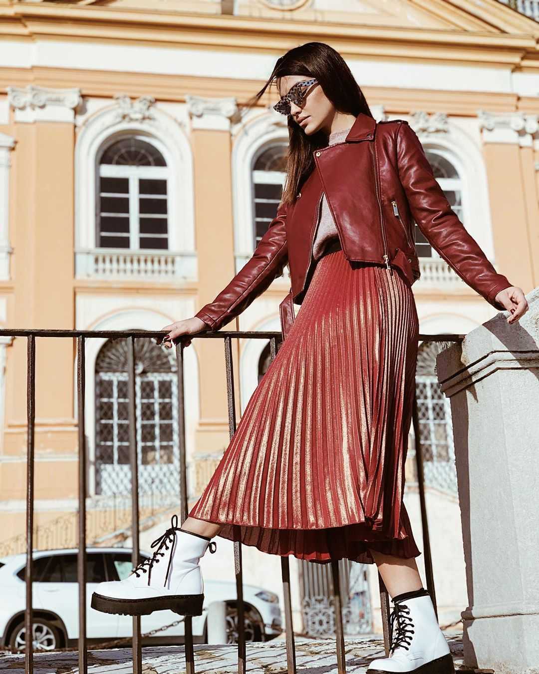 Как ни странно, зимой 2019 в тренде юбки из натуральной или искусственной кожи. Она хорошо сочетается как с яркими, так и с темными свитерами. Если надеть свободную блузку, получится превосходный образ для свидания. Он будет сексуальным, но не вульгарным.