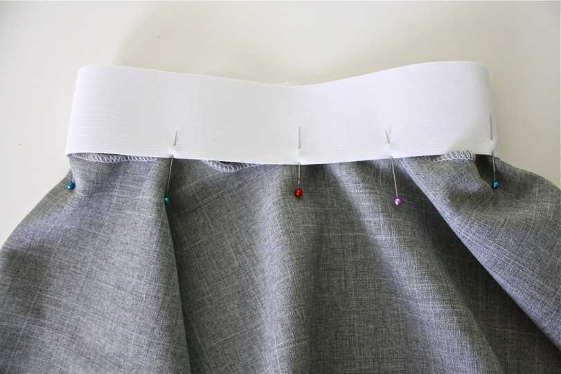 - Резинка прикладывается к верху юбки, подгибается таканью и подшивается. Есть и другой вариант: резинку можно пришить в пояс.