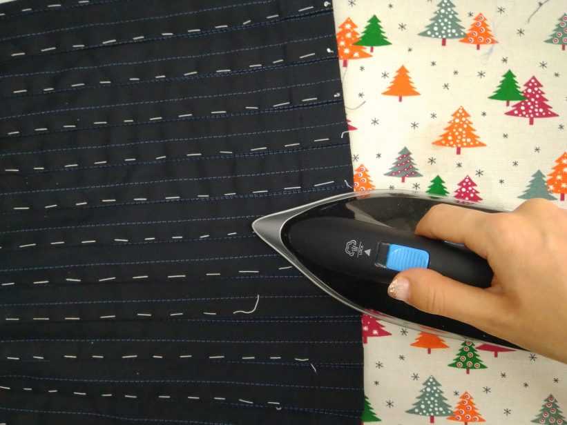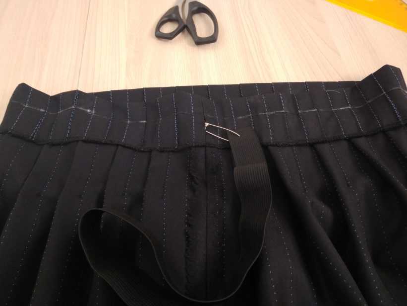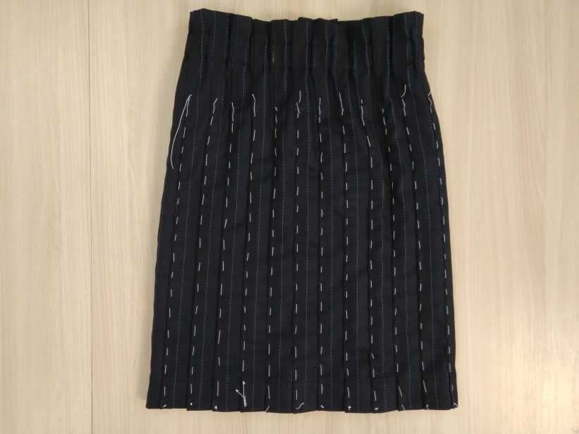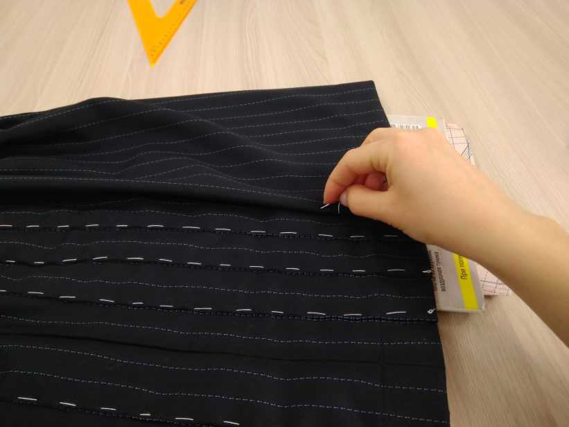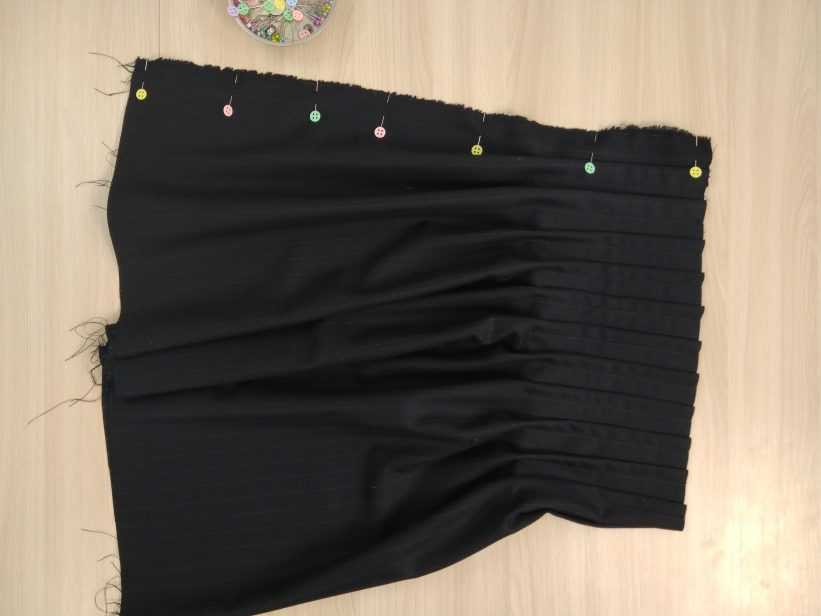 - Сверху и до линии бедра складки заутюживаются, от этого места и книзу прошиваются наметочным швом.