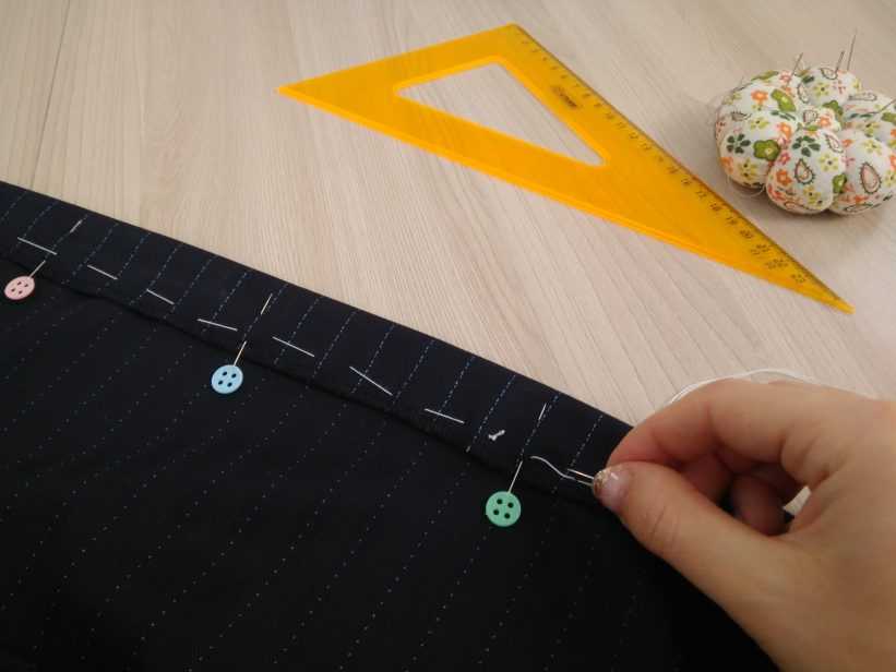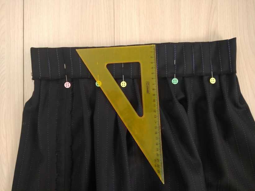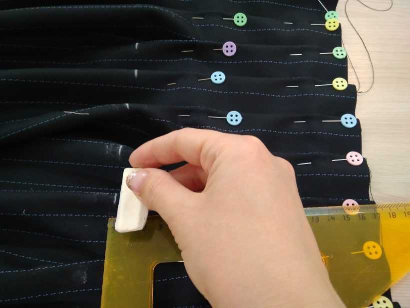 12. Подгибаю нижний срез на изнанку по меловой линии. Фиксирую булавками, приметываю вручную