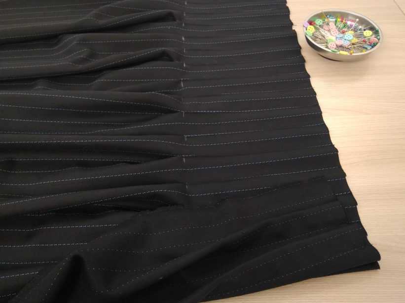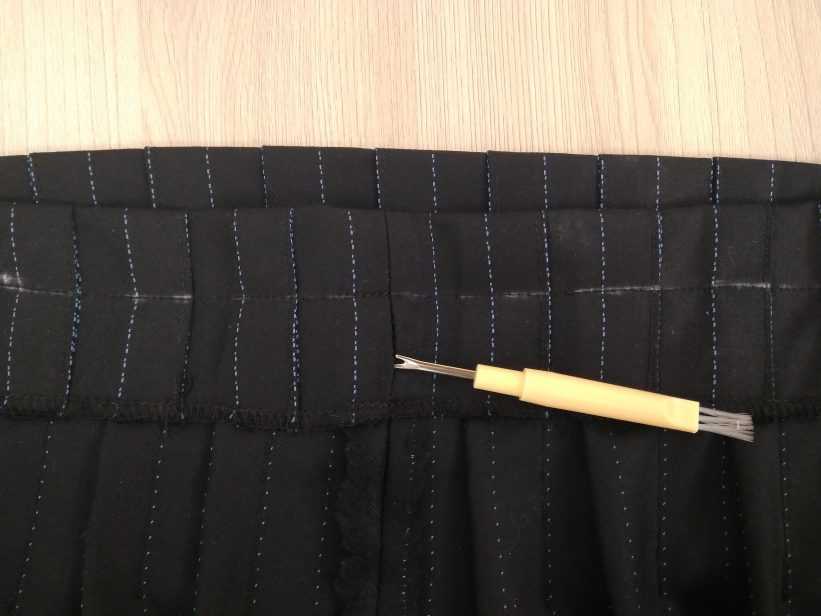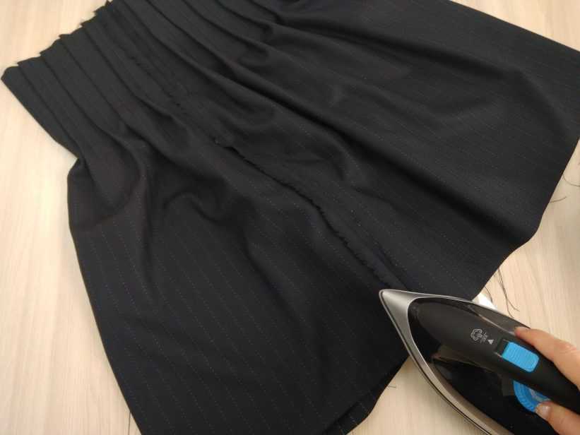 15. Заутюживаю складки утюгом с паром. Сделать это лучше качественно, застаивая каждую складку через проутюжильник. Я делала на гладильных подушках, которые дают хороший тепловой прогрев ткани. Потом следует подождать пока юбка остынет.
