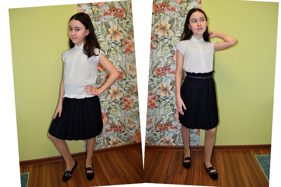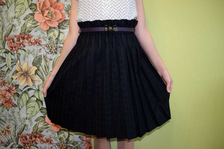 На этом мастер класс юбка в складку сшить своими руками закончен. Результат получился лучше магазинного, итальянская костюмная ткань, которая не полиняет и не электролизуется. Главное — дочь от обновки в восторге, юбку можно носить разными способами, с ремешком и с блузкой на выпуск, оба варианта смотрятся интересно и не скучно.