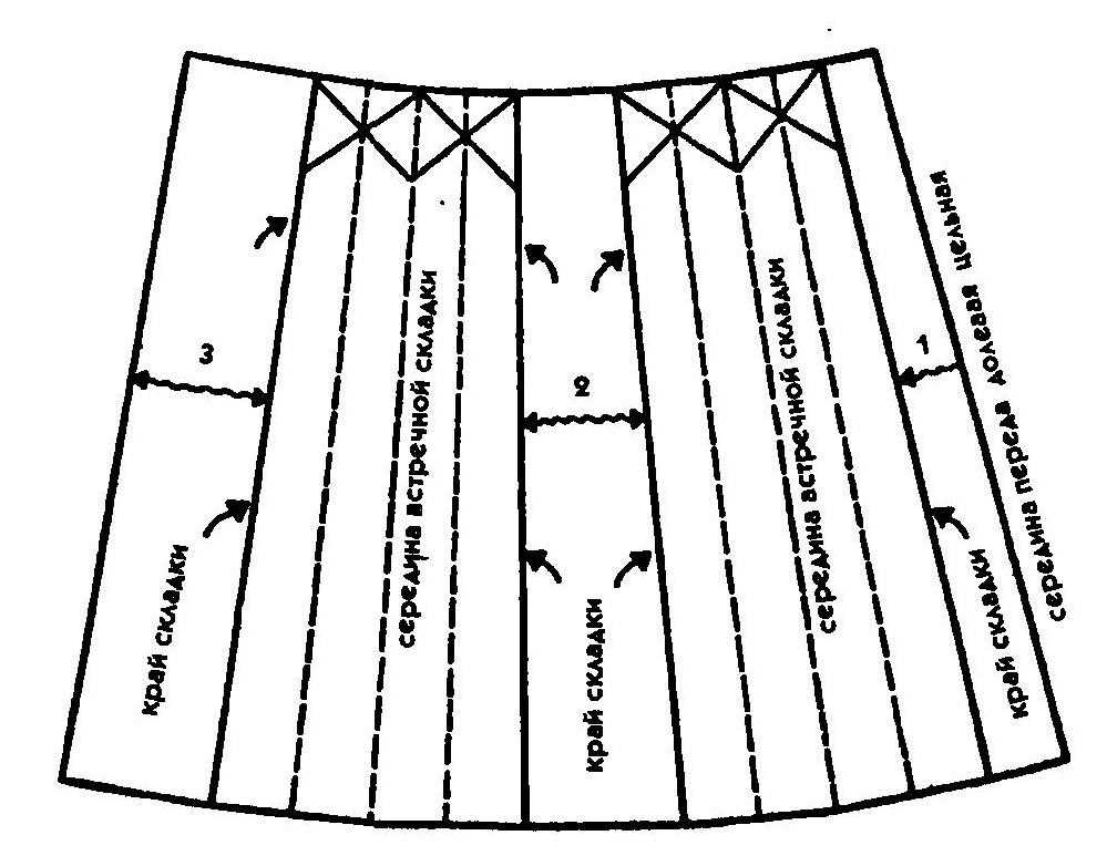 - для встречных закладываются 2 одиночные складки, загибаются друг к другу и складываются, затем прострачиваются или втачиваются в пояс;