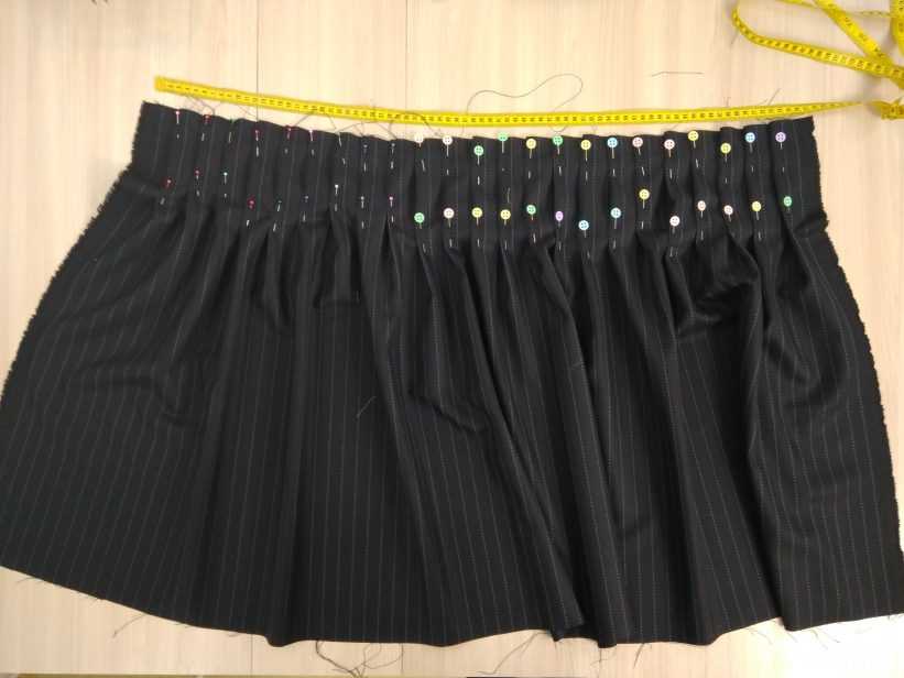 - По линии талии излишки ткани равномерно убираются в глубину сгибов. Теперь от верха и до бедра тоже прошейте наметочным швом, затем проутюжьте и можно строчить. Юбку сшивают сзади.