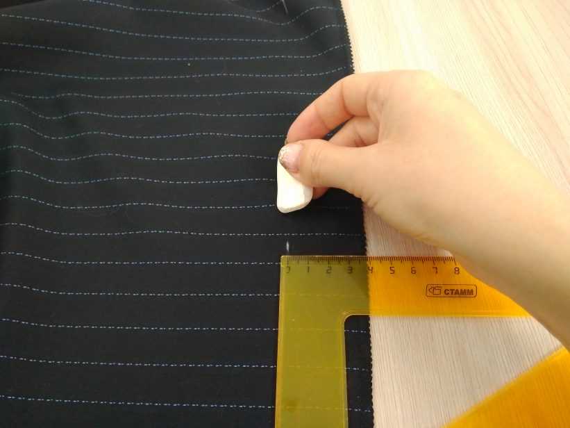 Перед нанесением линий убедитесь, что ткань лежит правильно, по фабричной кромке откладывайте длину юбки. Сверху отрезайте прямую полоску на пояс.